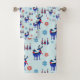 Uma toalha de banho com um padrão repetitivo. Ilustrado com um par de veados escandinavos vestindo lenços vermelhos. Com marcas decorativas em seus corpos. Além de um trio de árvores de natal vermelhas e azuis com uma estrela no topo. Flocos de neve rico espalhados.
