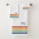 Elevate your bathroom decor with this Retro Monogrammed Minimalist Stripes Bath Towel. Designed with bold blue, turquoise, green, orange, and terracotta stripes, it brings a touch of vintage charm and modern simplicity to your daily routine. Personalize it with your initials for a unique, stylish touch, perfect as a thoughtful gift or a special treat for yourself. This towel is beautifully customized, this adds both comfort and character to any space.