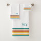 Elevate your bathroom decor with this Retro Monogrammed Minimalist Stripes Bath Towel. Designed with bold turquoise, yellow, orange and terracotta stripes, it brings a touch of vintage charm and modern simplicity to your daily routine. Personalize it with your initials for a unique, stylish touch, perfect as a thoughtful gift or a special treat for yourself. This towel is beautifully customized, this adds both comfort and character to any space.