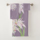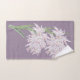 Este bonito conjunto de toalhas florais do banheiro apresenta orquídeas cor-de-rosa pastel com cor-de-água com um centro rosa sobre fundo roxo. Um conjunto de toalhas seria um cuidado com a casa ou outra ocasião para ela.