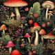 Whimsical mushroom illustrations with moss, ferns, and wildflowers