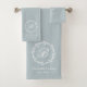 Conjunto de toalhas de banho com nome de família personalizado, com monograma personalizado cercado numa coroa botânica branca elegante.