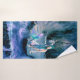 Sereia com cabelos turquesa numa rocha com um castelo atrás dela. Que tem uma cachoeira levando ao fundo do mar oceano.