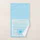 Defina tre asciugamani bagno, fondo celeste con disegno right e logo apto por vacanze.