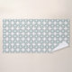 A patterned towel and matching washcloth are displayed. The design features teal and white geometric motifs, conveying a clean and modern aesthetic.