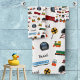 Add a cute train theme to your child's bathroom with this adorable custom railroad pattern bath towel set. Towel set has trains, train tracks, railroad signs, and gates. Add the first name of your little kid for a personal touch. The Choo Choo text is also editable.
