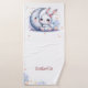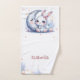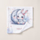 Toalha de banheiro super fofa com um belo coelhinho branco vestindo um belo arco rosa sentado perto da lua da lua prateada com algumas estrelas douradas caindo.