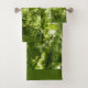 This towel set keeps you in sync with the season. It features a beautiful variegated maple leaves canopy as seen from underneath during the height of Summer. This pattern makes a great accent on the wash cloth, hand towel and bath towel. Customize with text if you prefer not to have just the green edge.