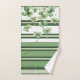 O trevo irlandês bonito pendura do topo deste conjunto de toalhas listradas do banheiro que você pode personalizar para o Dia de São Patrício e todos os feriados irlandeses. As faixas verdes aparecem por todo o conjunto de toalhas verdes.