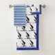 Windsurfer em conselho, monograma e listras de toalha de banho de windsurfe que apresenta um ícone de pictograma minimalista de um surfista de silhueta preta sobre fundo branco com uma borda azul. O pano de lavagem é branco com o seu monograma e uma borda azul, enquanto a toalha da mão inclui um padrão listrado azul de duas tonalidades.