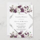 Design apresenta um elemento floral impresso em tons roxos, violetas, lilases e brancos sobre folhas de folhagem rosas e pedras sobre um fundo de aquarela roxo. Excelente para as comemorações do casamento!