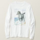 Uma camiseta de manga branca, com um Connemara Pony galopando pelas ondas na borda da costa, a partir de uma pintura aquosa de Judy Adamson.