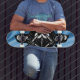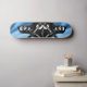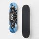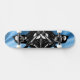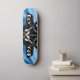 Todas as crianças vão querer um desses conselhos de skate excelente. Este conselho de skate de qualidade tem uma guitarra legal assustadora tocando design de esqueleto com um fundo azul girando. Presente perfeito para meninos no esporte extremo do embarque de skates.