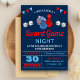 Convide seus convidados com este convite de aniversário de jogos de conselho legal com peças de jogos vermelho e azul e dados brancos com tipografia moderna contra um fundo azul escuro. Basta adicionar os detalhes do seu evento neste modelo fácil de usar para torná-lo um convite de tipo único. Sacudir a placa para revelar um padrão de listras azul e branca na parte traseira da placa.