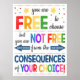 VOCÊ ESTÁ LIVRE PARA ESCOLHER, MAS NÃO ESTÁ LIVRE DAS CONSEQUÊNCIAS DE SUA ESCOLHA Um poster de excelente para pendurar em uma sala de aula, no escritório de orientação escolar, no escritório da assistente social escolar, no escritório de psicólogos infantis/psicólogos infantis ou até mesmo no quarto de adolescentes para lembrar às crianças que cada escolha que eles fazem tem uma consequência correspondente. Um lembrete diário de excelente para crianças e estudantes de todas as idades! Um poster muito brilhante e divertido para decorar a sala de aula de qualquer idade, escritório de assistentes sociais, escritório de terapeutas ou de conselheiros. Possui cores brilhantes para chamar a atenção deles.