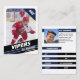Pais de jovens jogadores de hóquei no gelo em pequenas ligas podem mostrar orgulhosamente as realizações de seus filhos no gelo usando esses cartões de troca personalizáveis, azuis e brancos. As fotos da frente e do verso podem ser ajustadas para realçar seu jovem jogador, permitindo um novo Jersey Number. Quase todo o texto nas costas do cartão é editável, cobrindo estatísticas de jogador, bio e posição. Estes cartões são amplos para compartilhar entre amigos e familiares, e para o seu filho trocar com outros jovens que possuem seus próprios cartões de troca coletiva. Esta coleção forma um conjunto único de cartões de hóquei no gelo, perfeito para diferentes oportunidades de presentes.