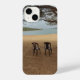 Esta imagem mostra uma capa de telefone com uma cena tranquila à beira de um lago. Duas cadeiras plásticas vazias estão no chão arenoso de frente para uma massa de água calma. Ao fundo, colinas suaves se estendem ao longo do horizonte sob um céu suave e nublado. Ramos de árvores enquadram a parte superior da cena, adicionando uma atmosfera natural e tranquila. O cenário evoca uma sensação de solidão, reflexão e companheirismo silencioso.