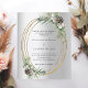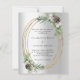 Para um casamento no inverno. Um fundo com aspecto fino de prata decorado com cones, bagas brancas e verde. Uma falsa armação de ouro. Personalize e adicione seus nomes e detalhes. 1 folha = 1 convite impresso de borda a borda.