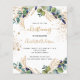 Um fundo branco decorado com verde de eucalipto e folhas de ouro e gotas falsas de ouro. Personalize e o nome e os detalhes da cerimônia. Letras pretas e ouros coloridas. Traseira: fundo branco com quedas de brilho de falso ouro