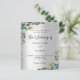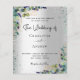 Fundo de aspecto fino prateado decorado com verde de eucalipto, folhagem de ouro e brilho verde e prata, faíscas. Personalize e adicione seus nomes e detalhes do casamento. Letras negras.