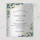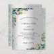 Fundo de aspecto fino prateado decorado com verde de eucalipto, folhagem de ouro e brilho verde e prata, faíscas. Personalize e adicione seus nomes e detalhes do casamento. Letras negras.