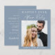 Casamento privado, empoeirado, azul, empoeirado, anúncio de elopemento e convite de recepção que mostra sua foto, "Felizmente Nunca Depois da Festa" em uma mistura de simples tipografia branca e um guião branco moderno e chique e seus primeiros nomes e data do casamento. Ao contrário, personalize seu anúncio e convite e adicione seus nomes em um script semelhante a assinatura.
