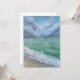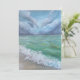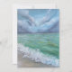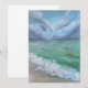 A pintura retrata um litoral tranquilo com ondas suaves rolando sobre a areia. A água é uma mistura de azuis e verdes profundos, capturando o movimento e a textura do oceano.