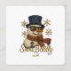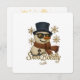 Um boneco de neve cintilante com um chapéu preto, cachecol âmbar e óculos de sol, emoldurado por flocos de neve dourados. Ideal para roupas de inverno, roupas infantis e presentes festivos.