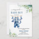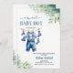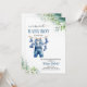 Bem-vindos ao seu cavalheiro de estilo com este adorável convite de chá para o bebê! Apresentando uma fina linha de tecido decorada com macacos azuis, meias e uma tigela. Este design é acentuado com verde macio para um toque charmoso e clássico. Os tons azuis gentis e os detalhes brincalhões criam uma sensação quente e alegre — perfeita para celebrar o dia especial do seu bebê. Personalize com seus detalhes de eventos para manter que os hóspedes vão tesourar!