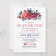 Magro e elegante convite de festas, 16 modelo, com um vibrante vermelho-boêmico, burgundy e rosa-pincel, pintado com buquê azul-marinho escuro, penas e riscas. Preencha suas informações nos pontos, Você pode personalizá-las mudando ainda mais as fontes, as cores das letras ou a cor vermelha brilhante do plano de fundo no verso. — O convite é adequado para primavera ou verão | país rústico | floral chic elegante | um doce moderno de jardim, 16 anos ou outras festas de aniversário. — Se você precisar de assistência com o design, por favor, entre em contato comigo!