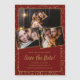 Elegante vermelho burgundy e armações de fundo de confete dourado 3 das suas fotos de casal. O texto é ouro profundo. Salvar a Data é gravada em um texto de script em negrito. 4 linhas de texto permitem descrever seus planos de casamento para seus convidados.