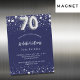 Um convite magnético moderno, na moda e glamouroso para uma festa de aniversário 70. Um fundo azul marinho, decorado com estrelas de falso prata. Personalize e adicione seu nome e detalhes da festa. O número 70 é escrito com uma fonte no estilo do balão.