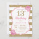 Convite de aniversário de 13 rosa e Dourado. Coloração rosa e Dourada. Listras brancas e rosa. Flor Floral Rosa. Aniversário de criança. Festa de aniversário. Para mais personalização, clique no botão "Personalizar" e use nossa ferramenta de design para modificar este modelo.