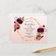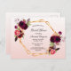 Na frente: um rosa dourado da moenda, fundo de gradiente branco com um quadro fino em forma geométrica dourada. Decorados com flores, rosas e penas do estilo "boho" escuras e burguesas. Modelos para o nome da noiva e detalhes da festa. O nome é escrito com um script de estilo manuscrito, letras pretas. Dica: Se você não quiser que pareça um cartão postal, clique em personalizar, vá para o verso e remova o divisor e o carimbo de posto.