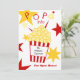Convite público para professores com ilustração de um recipiente listrado vermelho e branco de pipoca cercado por estrelas na fron. As costas são vermelhas e brancas. Personalize o texto na frente e atrás.