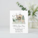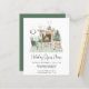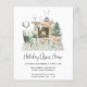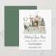 O convite à casa aberta, inspirado no orçamento, apresenta uma aquarela ilustrativa de um confortável sábio interior verde e lareira decorada para o Natal com coroa, rena, árvore de Natal, velas e gnomos.