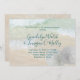 Convites de casamento com dois dólares de areia e plano de fundo de praia. O texto verde-azul escuro começa com "Você é convidado para a cerimônia de núpcias unindo" com nomes do casal em script de tamanho excessivo. As restantes informações da cerimônia são impressas num parágrafo. O fundo é a espuma marinha vindo na costa, com dois dólares de areia branca no canto inferior direito. Este design também vem como um download instantâneo.
