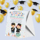 Comemore sua graduação no jardim de infância com este vibrante e personalizável convite para o editável para qualquer ano. O design ostenta um belo pano de fundo azul claro e alegre adorado com ilustrações adoráveis de um garoto e menina vestindo bonés de formatura, segurando diplomas, e rodeado por materiais e elementos coloridos da escola. Personalize este convite para se adequar à sua classe de jardim de infância e tornar sua celebração realmente especial!