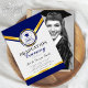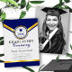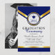 Este design de convite para a cerimônia de formatura apresenta um elegante layout formal de cores azuis, de cinza clara e douradas com chapéu azul de graduação e estrelas azuis. Personalize o seu próprio quadro de graduação no final do convite.