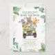Acentos verdes, brancos e dourados com animais da selva cavalgando em um veículo safari. Design tem verde e folhas e fundo branco. É tão fofo para um chá de fraldas de menina. Consulte produtos de chá de fraldas correspondentes.