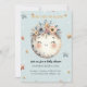Este é um convite de chá de fraldas com tema celeste que apresenta uma lua sorridente adornada com uma coroa floral, cercada por estrelas bonitinhas e alegres. O texto "Estamos sobre a Lua!" transmite entusiasmo para o próximo bebê. As cores pastel suaves, os sotaques dourados e a design caprichosa criam um sentimento sonhador e animador. O convite inclui detalhes do evento, como data, hora, local e informações de registro, fazer-o bonito e funcional para celebrar os futuros pais.