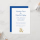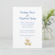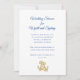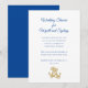 Casamento ou chá de panela náutico. Cartões brancos com texto azul marinho e duas âncoras douradas para representar o casal. A fonte de script no topo é maior para o tipo de evento e para quem é. Todos os outros textos são acrescentados a um parágrafo para incluir tantas linhas quantas forem necessárias.