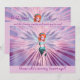 Uma fada mágica moderna com asas roxas, uma banda de alcaçuz no seu cabelo vermelho e uma perna levantada enquanto voava através de uma explosão estrelada de pinks e roxas, de cor pastel, no espaço.