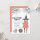 Uma bela ilustração de bruxa com caldeirão, vassoura e corvo, convite da festa de Halloween. Bonita, mas não muito assustadora para crianças pequenas.