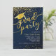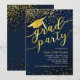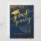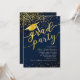 Este design de convite de graduação apresenta um fundo azul escuro com confete de brilho dourado, chapéu de graduação com tassel e fonte de "formando party".