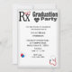 Receita para Graduação, faça uma festa e comemore. Este convite para a graduação tem o símbolo Rx com um boné de enfermeira, comprimidos, estetoscópio e um coração vermelho com uma linha de monitor cardíaco passando por ele. As costas têm um caduceus com um coração vermelho.