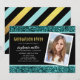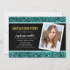 O Convite à Festa de formatura de Fotografias de Letra Glitter apresenta as palavras "Festa de formatura" numa fonte de sans serif divertida em folha de ouro falso com um brilho teal superior e inferior e um fundo de centro negro. O convite tem um padrão de tiras de folhas de ouro preto e preto e esfarelado atrás. Personalize-o substituindo o texto do marcador de posição e substitua a foto do marcador de amostra/marcador de posição por sua própria foto. Para obter mais opções, como alterar a fonte e seu tamanho/cor ou o espaçamento entre letras, clique no botão "Personalizar". *Observe que a Marca d'água do Zazzle que aparece na visualização de zoom NÃO aparecerá no produto impresso final. © Rosewood e Citrus