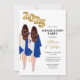 As gêmeas gêmeas convidam para a celebração de festas de formatura combinada de dupla graduação para irmãs gêmeas. Retrato de mulheres gêmeas com cabelo castanho comprido em vestido branco com vestidos marinhos de graduação em azul e bonés de formando com balões de ouro para a classe de 2025.