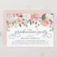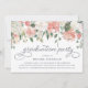 O convite para festa de formatura floral de aquarelas moderno apresenta uma fronteira superior de rosas, peões e eucalipto em tons de rosa-pincel, pêssego, creme e verde. Personalize com o texto desejado do convite de festa de formatura usando os campos modelo.