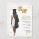 Convite à Festa de formatura na Escola de Enfermagem. Enfermeira Convite para sua filha, sobrinha, mãe, tia, primo ou amigo que está se formando na escola de enfermagem e agora é oficialmente enfermeira. Enfermeira Enfermeira, Convite à Graduação na Escola para Festas de formando celebrando mulheres que acabaram de se formar na escola de enfermagem. Celebre a nova enfermeira registrada com este elegante convite para a formatura de enfermagem! Apresentando um retrato ilustrado de uma mulher de pele escura com cabelo curto. O formando da enfermeira está vestindo um vestido branco na moda, um roupão de graduação preto enrolado sobre o ombro, e um boné de formatura preto correspondente. Ela segura balões em forma de folha de ouro com as letras RN numa mão e um estetoscópio na outra mão. Acentuado com o confete dourado, ele captura perfeitamente a alegria e o entusiasmo de sua grande conquista.